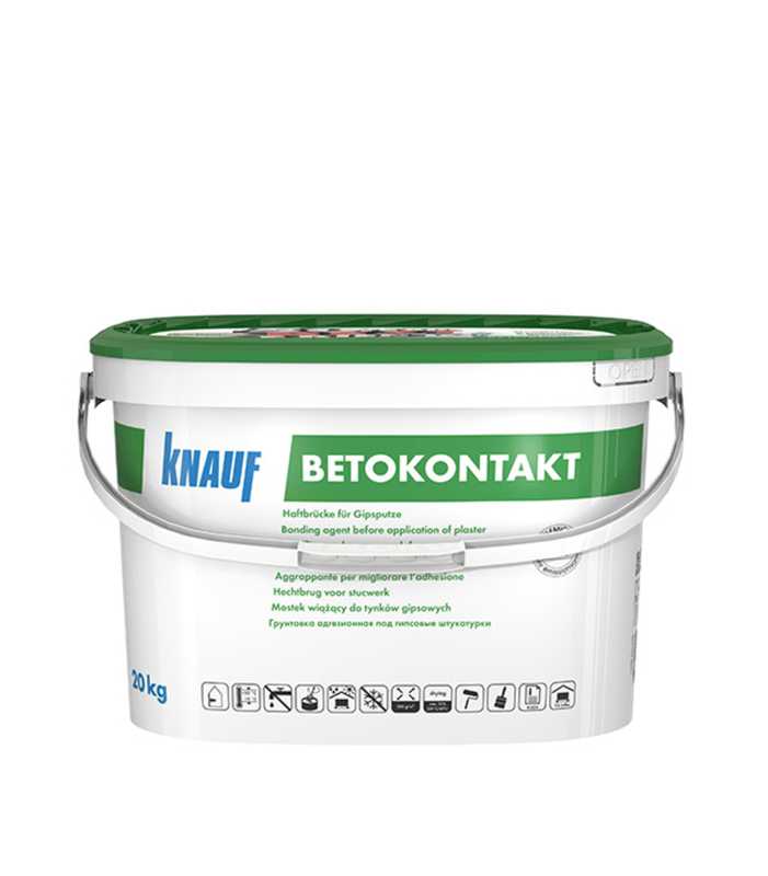 Грунтовка адгезионная КНАУФ-Бетоконтакт предназначена для обработки плотных, гладких, слабо- и не впитывающих влагу оснований, например, бетона, цементных штукатурок, пенополистирола, ЦСП, гипсовых пазогребневых плит под гипсовую штукатурку и гипсовую шпаклевку.